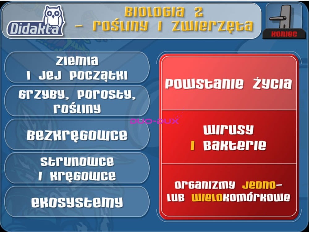 Multimedialny program edukacyjny Didakta – Biologia 2 służy do przećwiczenia wiadomości i znajomości z zakresu świata roślin i zwierząt, przeznaczony dla klas 4-8 szkoły podstawowej. Tytuł Didakta – Biologia 2 Rośliny i zwierzęta zawiera ćwiczeniainteraktywne, umożliwiające cztery warianty sprawdzenia wiadomości – pytania testowe, łączenia w pary, decydowanie o poprawności stwierdzenia i zadania z rysunkami.