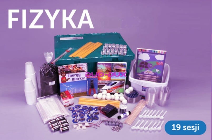 Duży zestaw pomocy dydaktycznych do realizacji podstawy programowej z fizyki, przeznaczony do przeprowadzenia i omówienia działań badawczych i eksperymentów podczas 23 lekcji fizyki, przeznaczony do pracy w klasie 30-osobowej, w tzw. grupach badawczych.