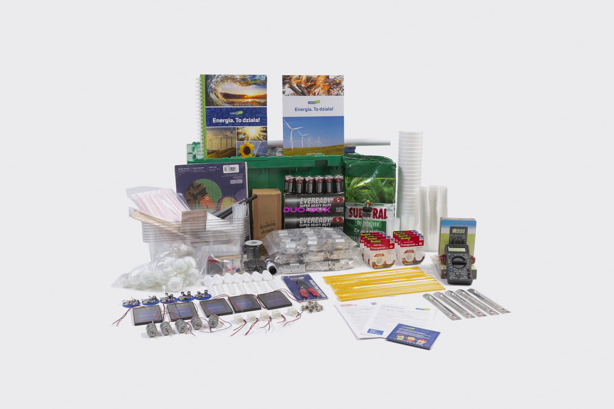 Moduł ENERGIA. TO DZIAŁA! wyposażony jest w wystarczającą ilość potrzebnych dla całej klasy substancji i przyborów pozwalających na wielokrotne wykonywanie bezpiecznych doświadczeń i eksperymentów w zespołach uczniowskich (w klasie do 30 uczniów)
