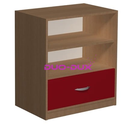 Szafka Primo 120 posiada szeroką szufladę w dolnej części oraz dwie otwarte wnęki.
