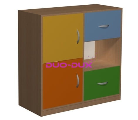 W lewej znajdują się 2 skrytki zamykane osobnymi, jednoskrzydłowymi drzwiczkami, a w prawej dwie szuflady i półka pomiędzy nimi.