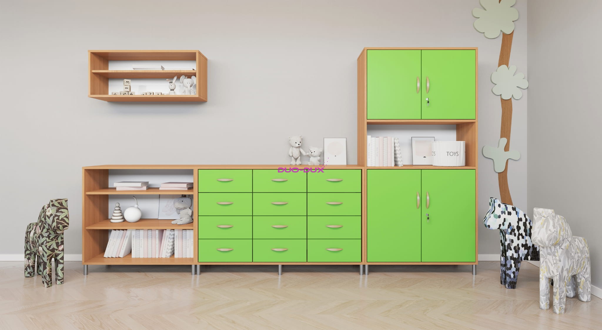 Kolorystyka zestawu na głównym zdjęciu: korpus buk / kolor frontów zielony.
